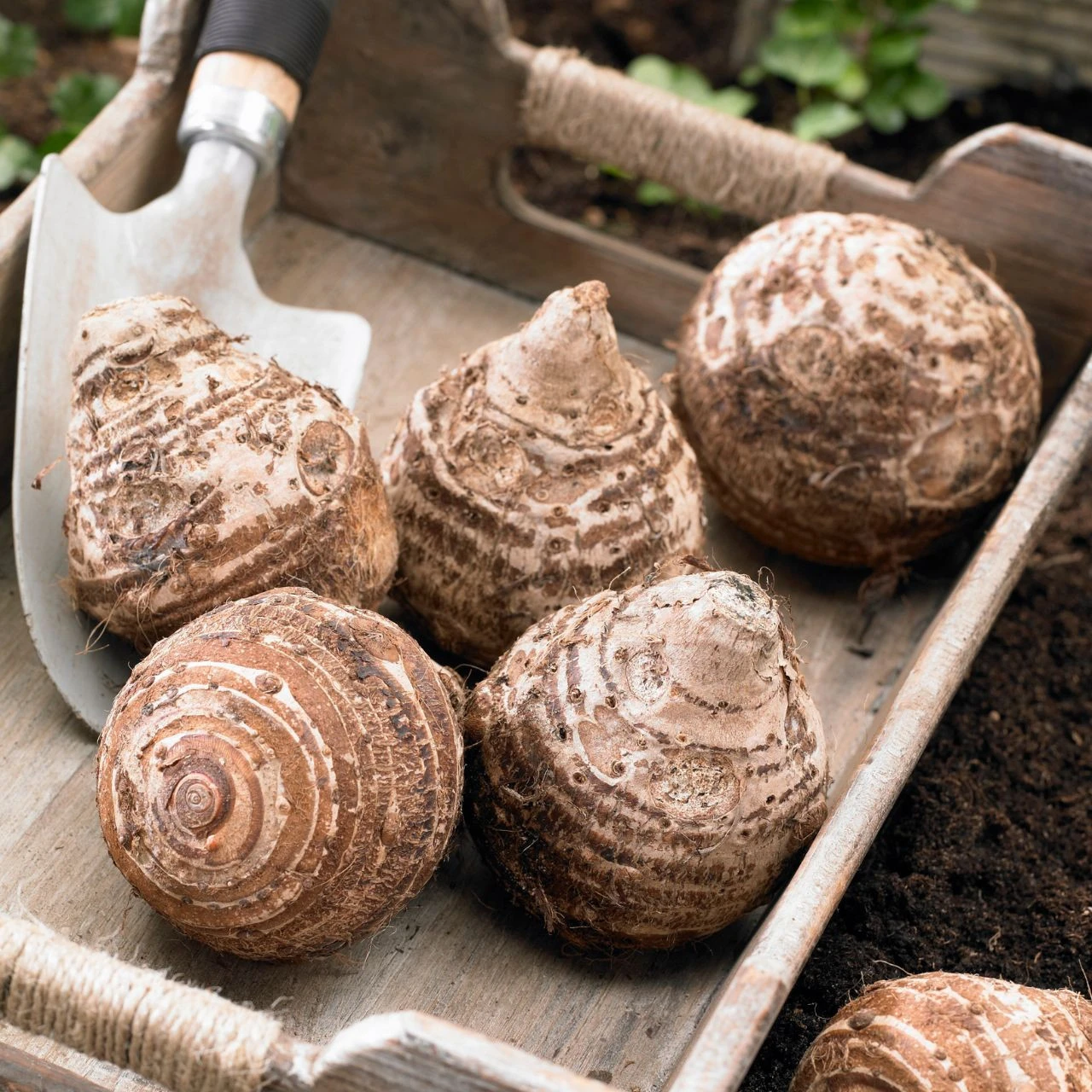 Commonly known as upright elephant ear, Alocasia macrorrhiza’s glossy, bright green leaves add an exotic look to beds, borders and pots. The big paddle-shaped leaves are held upright to shed water and make room for companion plants below. These heat-loving tropical plants can grow 5 feet tall in one summer.