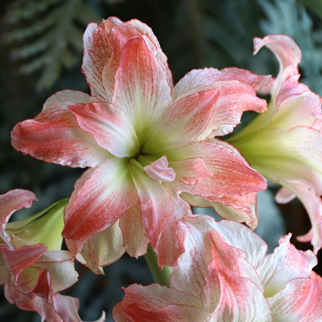 Named for Aphrodite, the Greek goddess of love, this beautiful double amaryllis has ruffled white petals and an apple green center. Each petal is edged in red and decorated with a tracery of fine brushstrokes. You can expect weeks of color with 3 stems and up to a dozen flowers.