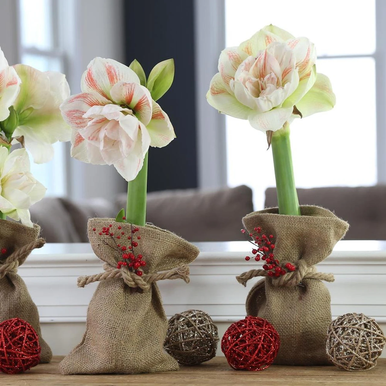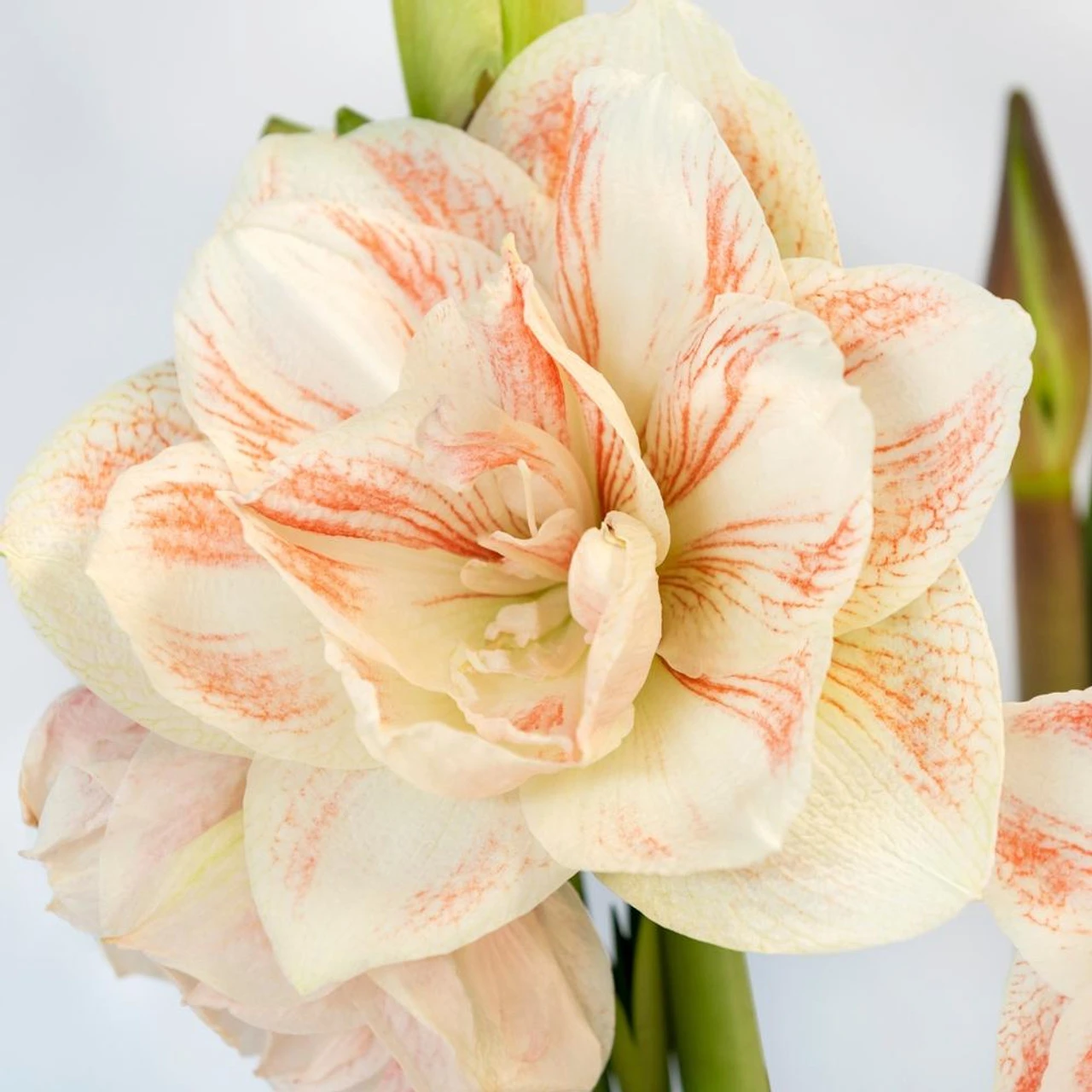 Nymph is a lush, double amaryllis with layers of glistening white petals, decorated with delicate traceries of red. The center of the flower and the outermost petals radiate a fresh, lemon-lime glow. Large, outward facing blossoms have a big presence and a romantic charm.