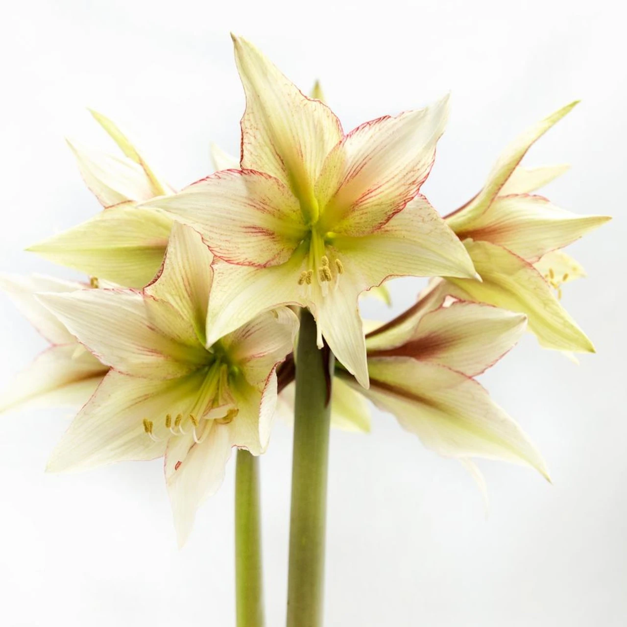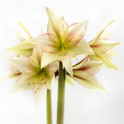 Few flowers can rival the artful beauty of this amaryllis. Its pale green and ivory petals are decorated with fancy brushstrokes of pink and burgundy that intensify as the flower matures. Lightly ruffled edges add texture and personality. If you love amaryllis, this one will be a favorite. You can expect 3 stems with 4 to 5 flowers per stem.