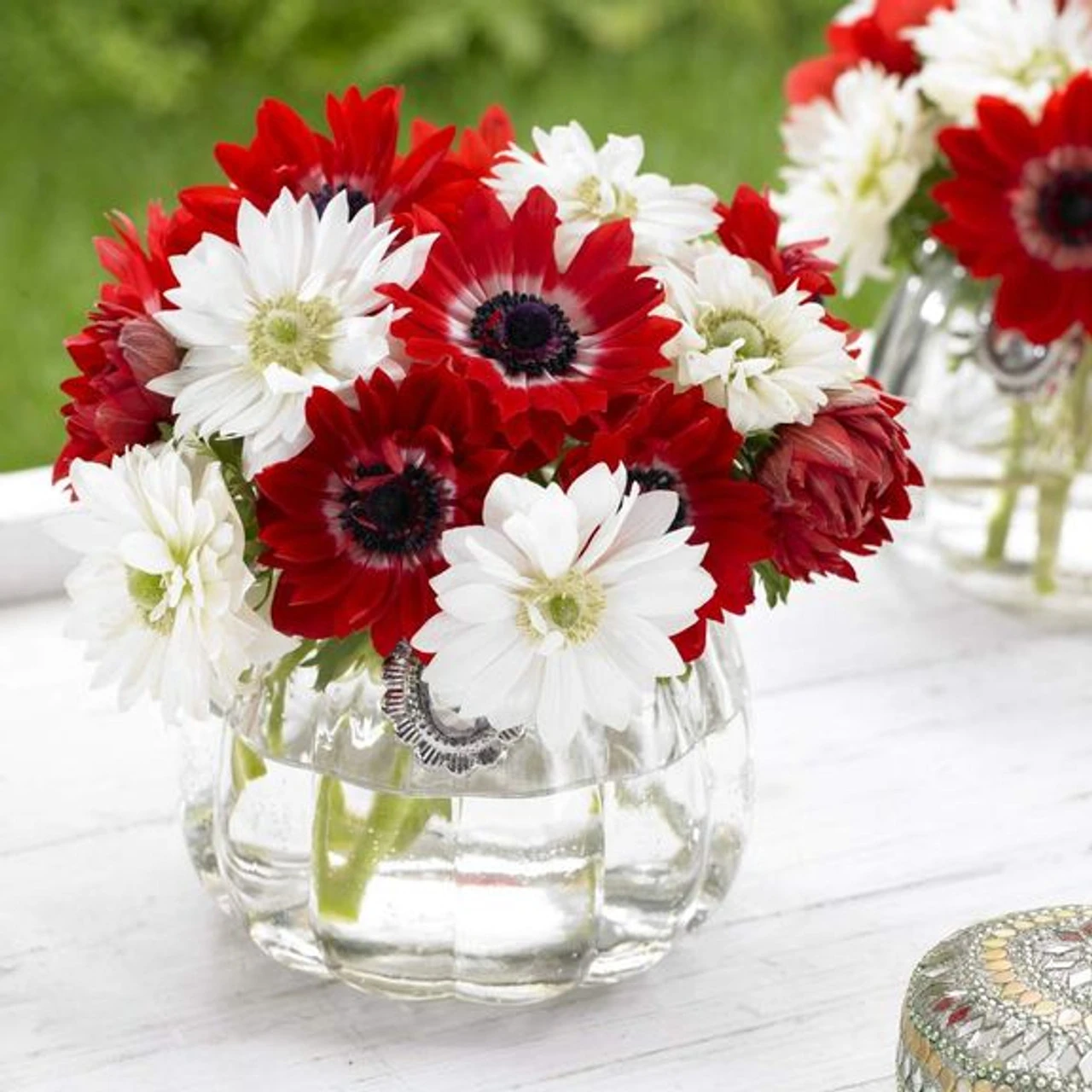 As cut flowers, anemones always command a high price. Why not grow your own? This combination of deep red and snow white blooms looks striking in the garden, in containers and in a vase. In areas with mild winters (zones 7-11), anemones should be planted in fall for early spring flowers. Provide protection from freezing temperatures. In colder zones (4-6), plant bulbs in early spring for early summer flowers.