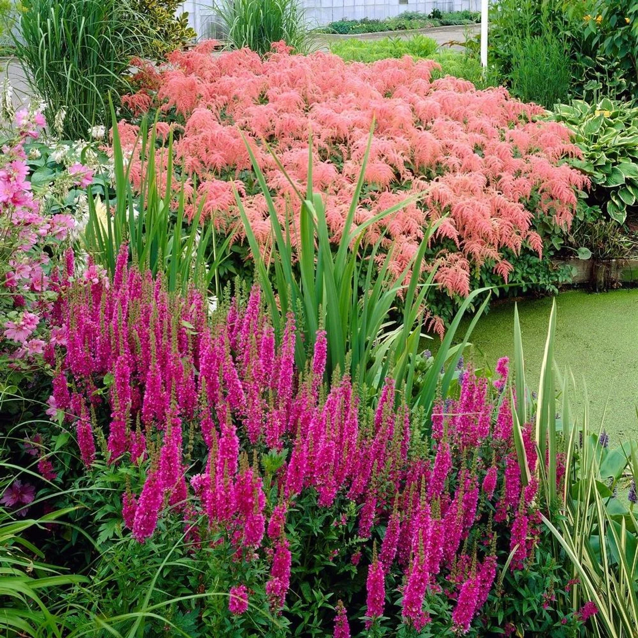 This popular variety’s gently weeping flower panicles and flamingo pink color make it easy to recognize. Straussenfeder is a well-mannered plant that grows just 18″ tall. Yet when in bloom, the flowers are double that height, rising to 3 feet tall. Bloom time is late spring to early summer.