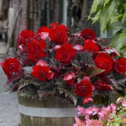Scarlet-red flowers and glossy, almost black foliage give this tuberous begonia a dramatic look. Grow these bushy, upright plants in a warm location where they will be protected from hot sun. You’ll enjoy a non-stop display of big, 3 to 4″ flowers from summer to frost. Start the tubers indoors in late winter and move the plants outside after all danger of frost.
