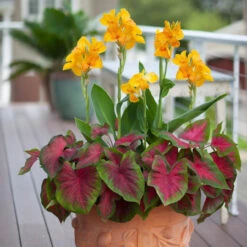 There’s no way to ignore these flashy red hearts, beaming out from across the yard. Florida Cardinal is a relatively new caladium that’s disease-resistant and vigorous. Give it warm soil and plenty of moisture, and it will reward you with months of carefree color. Thrives in shade, part-shade or full sun.