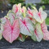 A sturdy, upright caladium with deep green leaves and brilliant red centers that are decorated with pink dots. Red Flash grows in sun or shade, so it’s a great choice for any area where you want a splash of bright color. As with all caladiums, it grows best in warm soil and appreciates consistent moisture.