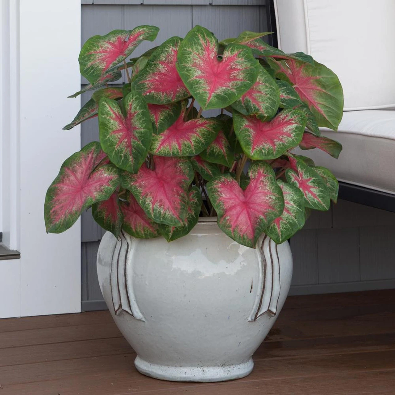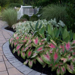 It’s easy to fall in love with this beautiful sun tolerant caladium. The medium green leaves have a bright, flamingo pink center and frosty white halo. Easy color for anywhere in your landscape, since it thrives in both sun and shade. Great in containers, too.