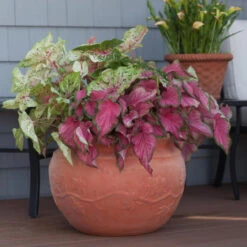 A brilliant, rose-pink caladium with contrasting green edges. Florida Sweetheart’s compact habit and slightly ruffled leaves make it a perfect companion for full size caladiums. A vigorous, dependable performer that will light up any shady area around your home.