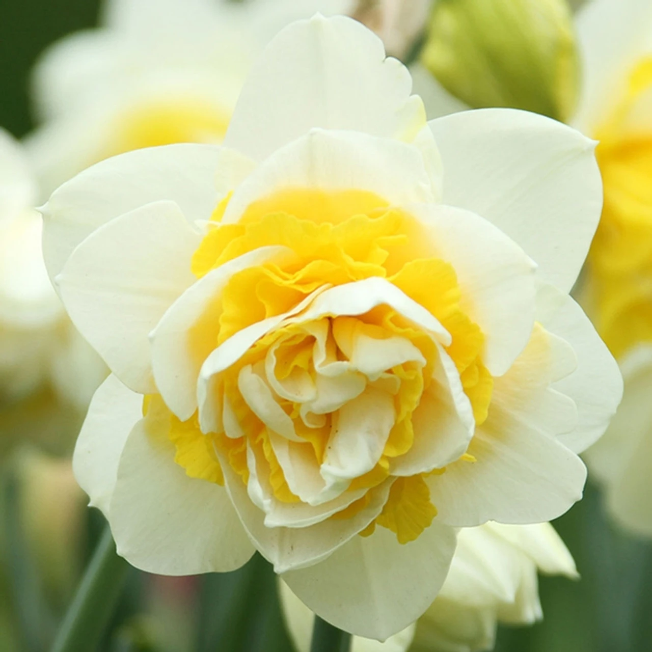 Dutch growers say these strong-stemmed daffodils “look up at you” to show off their beauty. The extra-large blossoms measure up to 4″ across and have thickly ruffled centers that display alternating layers of white and golden yellow petals. Lingerie blooms late in the daffodil season and is stunning in a vase.