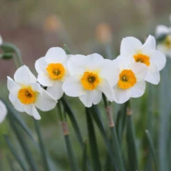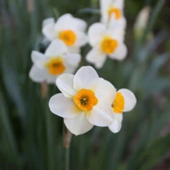 A pretty daffodil with a delightful, gardenia-like fragrance. The petals open pale yellow and quickly fade to ivory. They surround a small, bright orange cup set off by a lemon yellow halo. Each stem is a miniature bouquet of 2 to 3 flowers. Bloom time is mid to late spring.