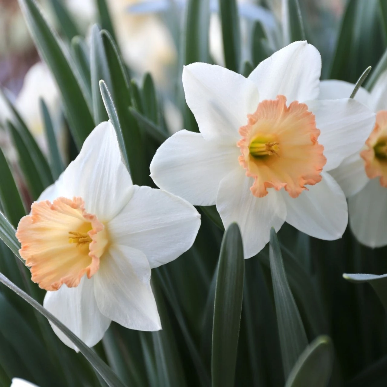 Pink Charm is an award winning daffodil with big blooms on tall, sturdy stems. The flared cup features coral-apricot ruffles, and is surrounded by large, pearly-white petals. Reliably perennial and a great choice for landscaping. Considered among the best pink daffodils.