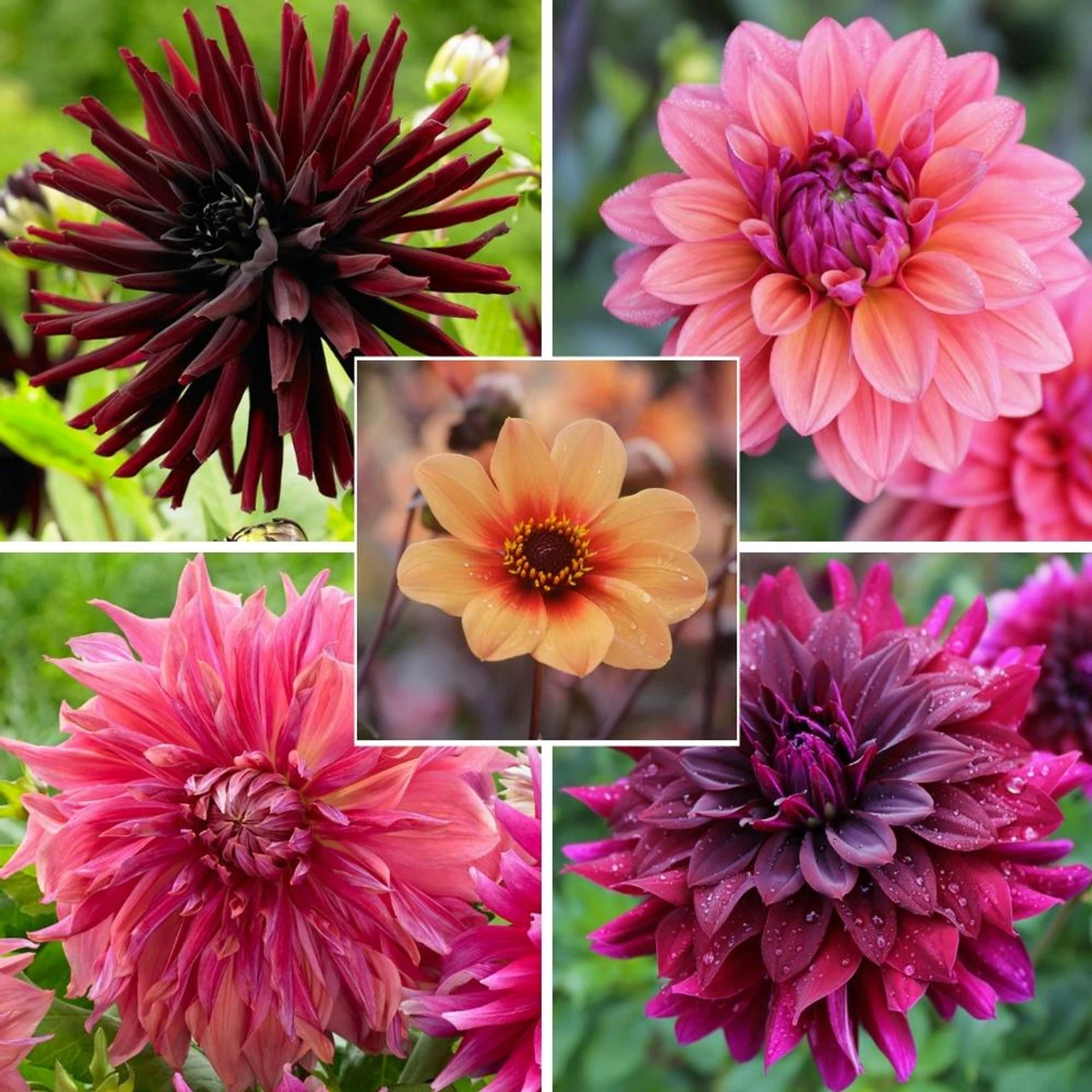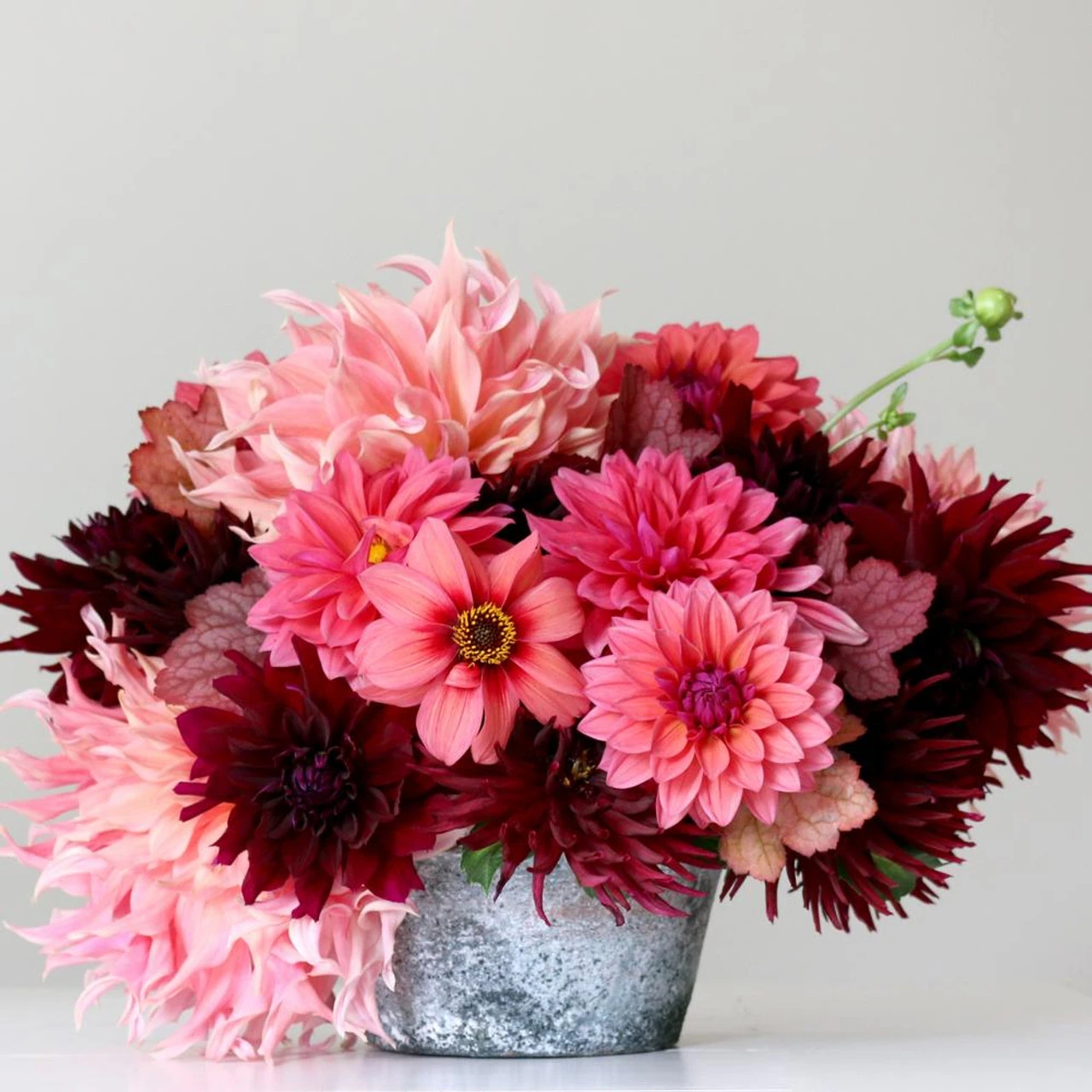 With this exclusive collection of pink and burgundy dahlias, you find it’s easy to compose arrangements that are just as stunning as this one. Created by Alicia Schwede of FlirtyFleurs.com, it includes five varieties, each with a different flower size and style to provide dynamic texture as well as a pleasing color harmony. Dahlias bloom from summer through fall and the more you cut, the more they bloom.