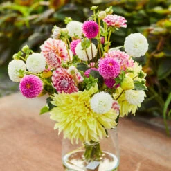 This sophisticated blend of flower styles and colors will give your arrangements a fresh new look. The two-tone flowers of decorative dahlia Hawaii pick up the pale yellow of dinnerplate dahlia Kelvin Floodlight. Petite pompons White Aster and Jan van Schaffelaar provide the perfect color echoes.