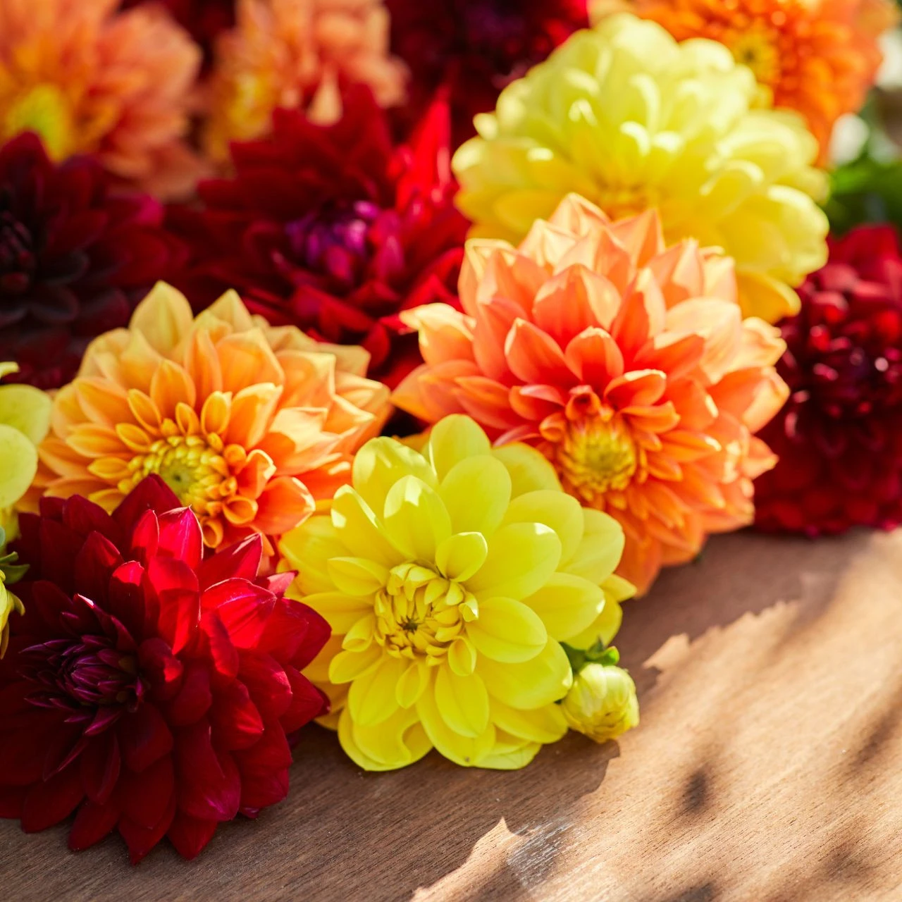 This blend of four classic dahlias delivers a punch of crowd-pleasing color. Lemon yellow Sun Lady and tangerine orange Sunset Tropical look even brighter when paired with burgundy Arabian Night and wine-red Wittman’s Best. Combine them with sunflowers and marigolds for a traffic-stopping flower bed.