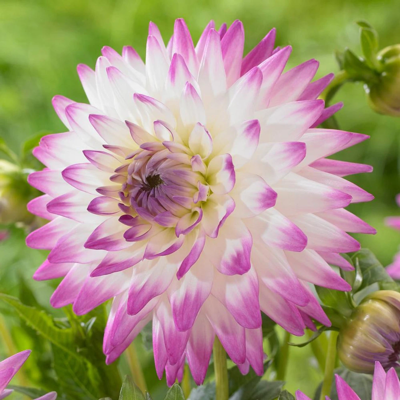 These creamy white flowers, tipped with lilac-purple, add a fresh look to bouquets and flower beds. The spiky, cactus-style blooms look beautiful mixed with glads, lilies and other late summer flowers. Like all dahlias, Jura blooms continuously from summer through fall.