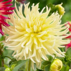One of the most popular yellow dahlias for 60 years running. As with other cactus-flowered varieties, Yellow Star’s quilled petals add interesting texture to flower beds and bouquets. Its pale yellow hue is luminous and never harsh. The flowers are 5 to 6″ across.