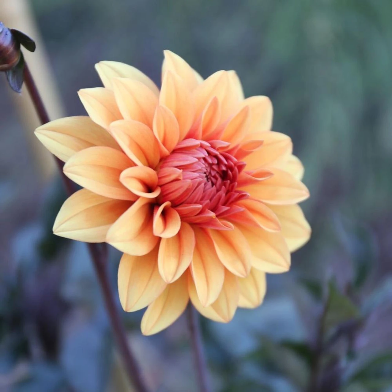 Dark foliage and glowing, golden-apricot blossoms make this award-winning dahlia a must for your summer garden. The 4″ to 5″ flowers have rounded petals and long, wiry stems. As they mature, the blossoms open wide to reveal chocolate-brown centers that attract bees and butterflies. An excellent dahlia for adding late season color to perennial gardens.