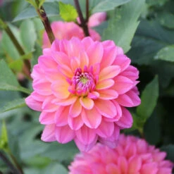 These pretty, two-tone flowers remind us of dahlia American Dawn. From a distance the color reads as peach, but up close it’s an unlikely combination of rose-pink and gold. Different and surprisingly beautiful! Blends well with purple, orange, yellow and burgundy. The 4 to 5″ flowers have dark, slender stems.
