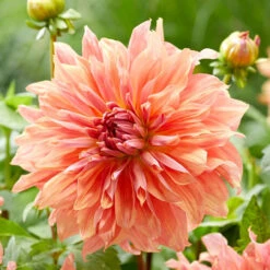 This dahlia is a blend of warm, sunset hues that run from apricot and coral to raspberry and rose pink. Loosely rolled and twisting petals give the impressive, 8 to 9″ flowers extra texture and movement. Tall plants with attractive, dark stems.