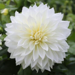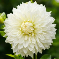 A classic dinnerplate dahlia with pure white blossoms. Gently twisting petals give the flowers a frilly look and a pale yellow center gives them a sunny glow. Each plant produces dozens of blooms so you can enjoy weeks of extravagant bouquets. A great choice for late summer or fall weddings.