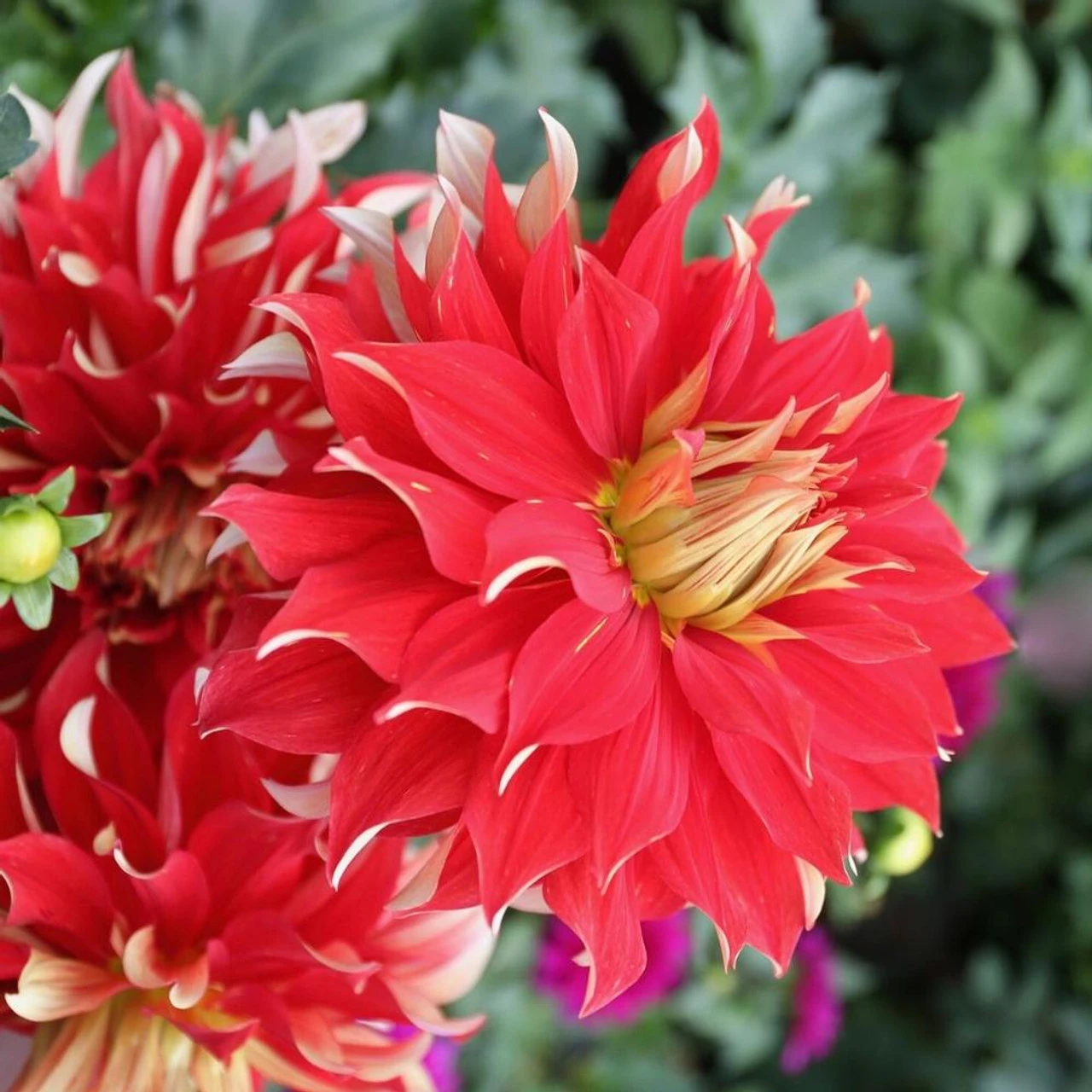 A distinctive new dinnerplate dahlia with long, fire engine red petals that twist and turn to reveal pale yellow undersides. This two-tone effect gives the extra-large blooms a big presence and a totally unique look. Attention-getters in the garden and in all your summer arrangements.