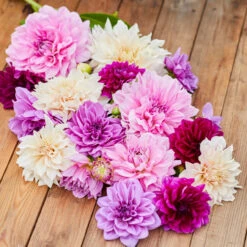This color-coordinated collection features four of our most popular dinnerplate dahlias. Hues range from ivory Café au Lait through Lavender Perfection, soft pink Lilac Time and burgundy-purple Thomas Edison. It takes just a few stems of their lush, peony-like blooms to make a stunning arrangement.