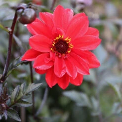 One of the dahlia world’s best-known varieties. Bishop of Llandaff’s semi-double flowers are scarlet red with a prominent dark center and showy yellow stamens. The plant’s burgundy-bronze foliage gives it extra appeal in garden beds and in containers. Bees and butterflies love the blossoms.