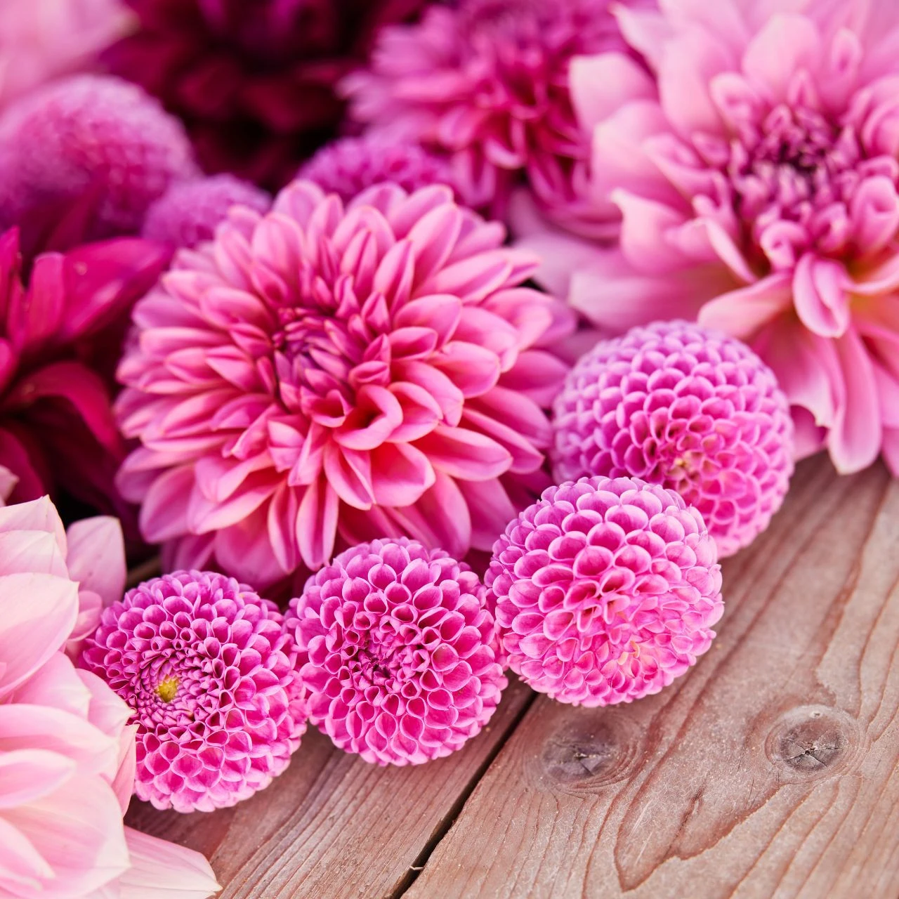 Perfectly round flowerheads with tightly cupped petals give pompons a look that’s very different from other dahlias. The 2 to 3″ diameter flower heads are good companions for full-sized dahlias, and the long-lasting blooms blend easily with lilies, glads, phlox and other summer blossoms.