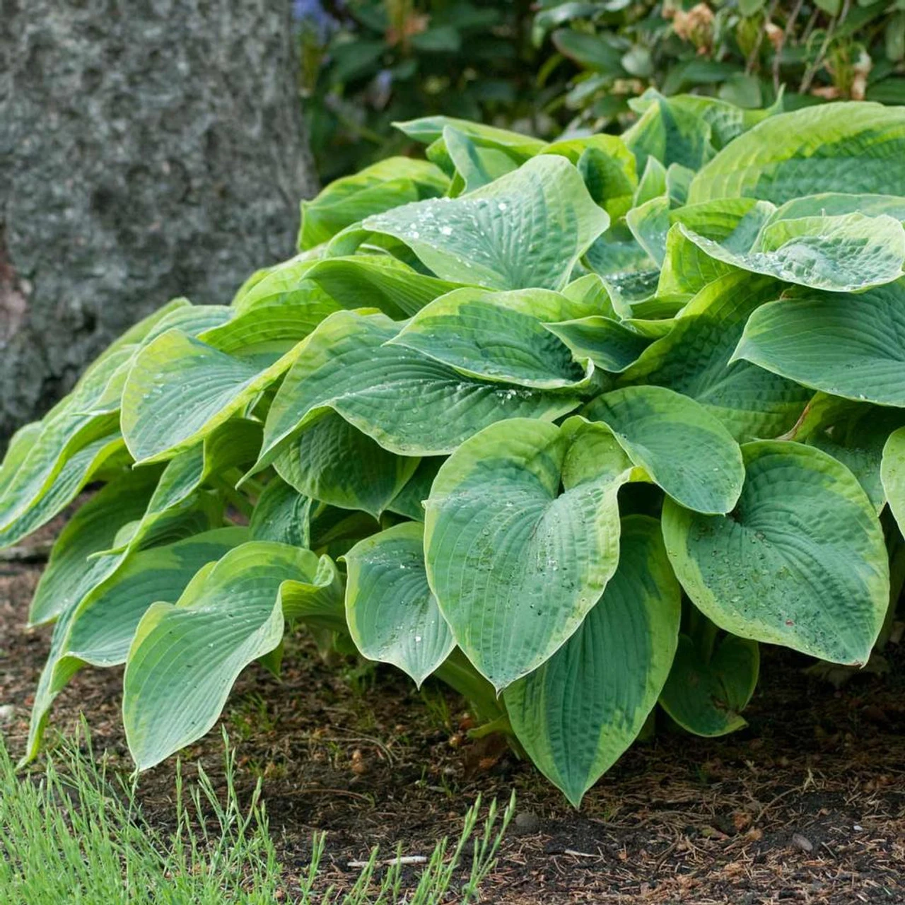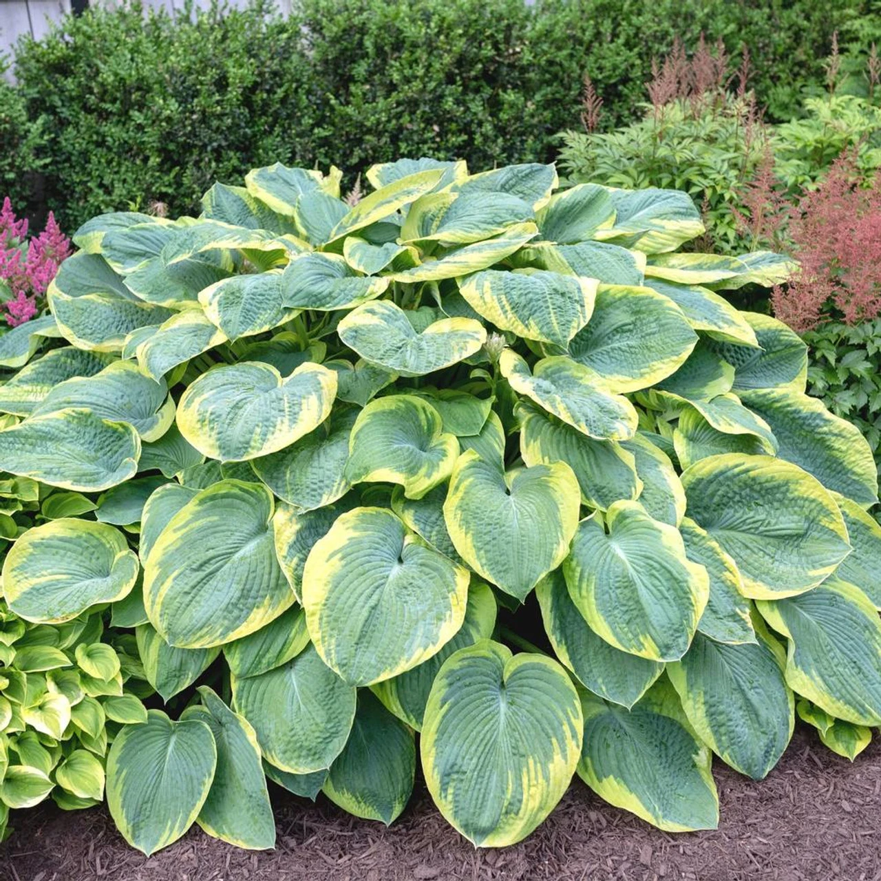 This hosta’s leaves are almost round and can measure up to 10″ across. They have blue-green centers and irregular lime green margins. The leaves are thick and substantial, with a heavily quilted texture. Lovely white flowers on tall stems in late summer.