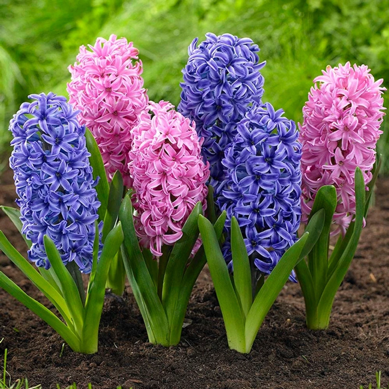 An eye-catching combination of two classic Dutch hyacinths. Blue Jacket’s cool blue flowers perfectly complement Pink Pearl’s cotton candy sweetness. Together they will scent your garden for weeks in mid-spring. Plant near the front of your flowerbeds, along a walk or in containers so you can enjoy their perfume up close. Hyacinths also grow well in containers.