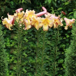 This Oriental-Trumpet lily’s enormous, golden-yellow blossoms will fill your late summer garden with their exotic fragrance. Rising Moon’s petals are edged in rusty rose-pink and the same color accents the back of each flower. Each towering, 5 to 6 foot stem bears up to a dozen trumpets. Like other Orienpets, these lilies are hardy perennials that bulk up over time and get better each year.