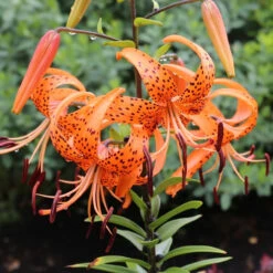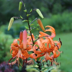 Though tiger lilies are native to Asia, they can now be found growing wild in New England and other parts of the east coast. The distinctive flowers are easy to recognize: bright orange, recurved petals with black freckles and long stamens. Shiny black bulbils line the stalks. The bulbs are good perennializer, so you’ll enjoy them for years to come.