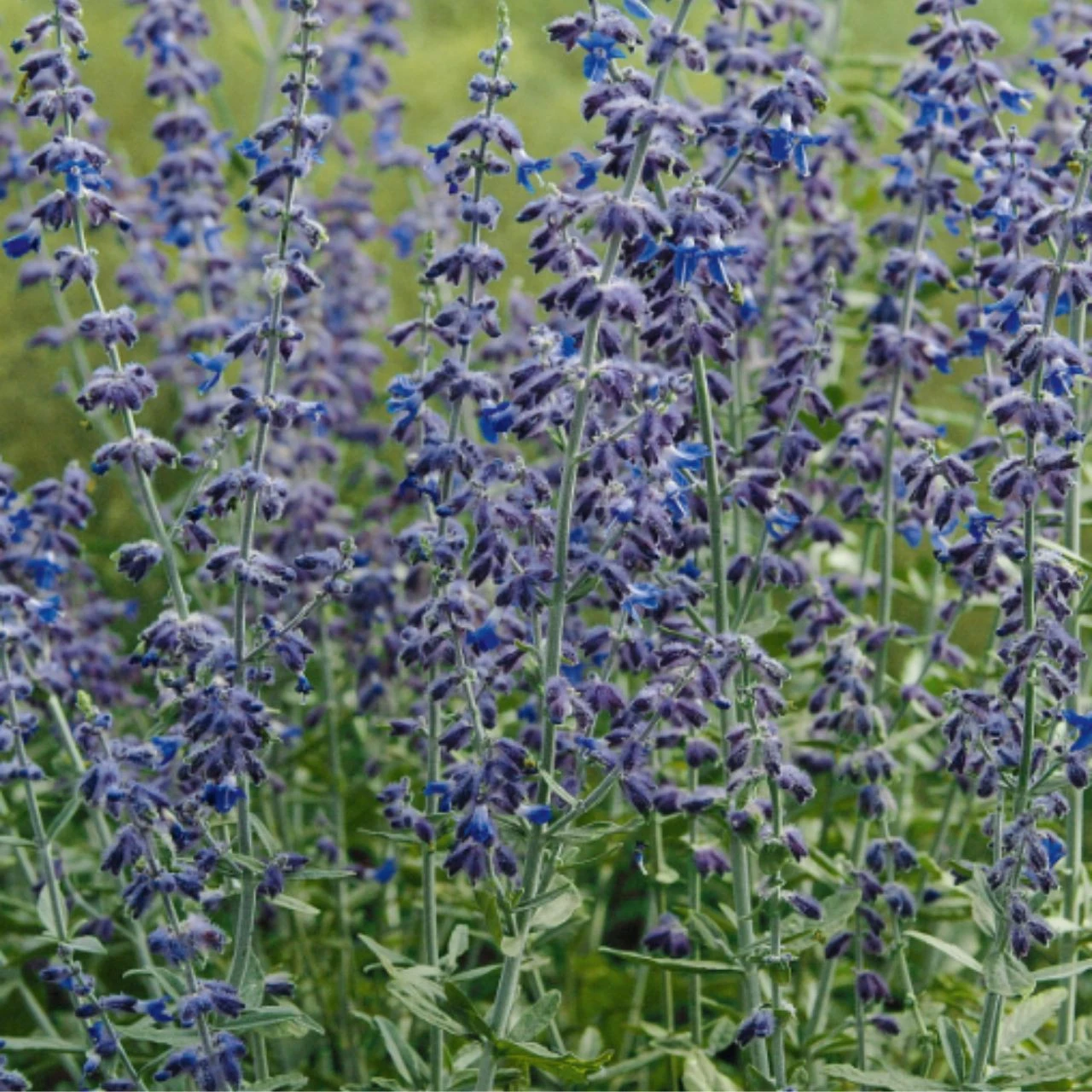 This new and improved variety of Russian sage has a bold presence in the garden. It grows up to 4 feet tall and wide, and its finely textured, grey-green foliage looks good all season long. Sprays of deep blue flowers appear in late summer and last into the fall.
