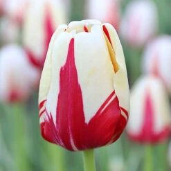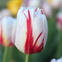 A stunning tulip with pure white petals that are brushed with flashes of red. Resembles the Rembrandt tulips of old, but has the health and vigor of today’s modern tulips. The tulip Bastogne makes a beautiful companion.